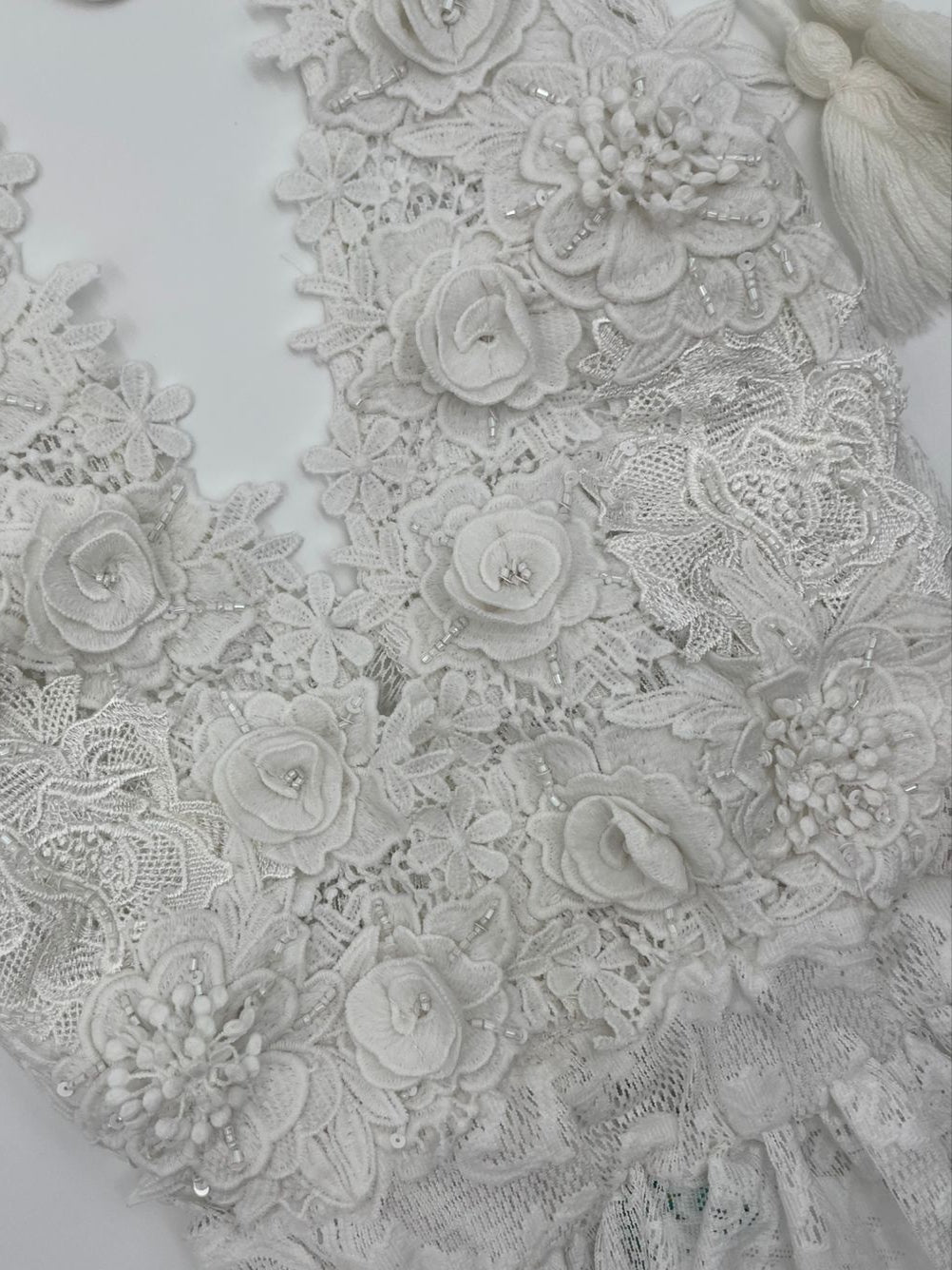 - Plunging halter neckline adorned with 3D floral appliqué details.