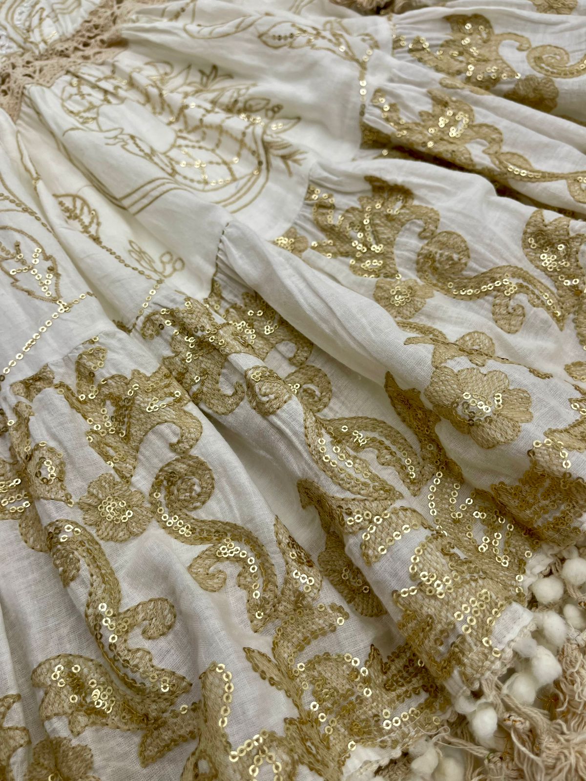 - White base richly decorated with gold sequin embroidery and intricate thread details.